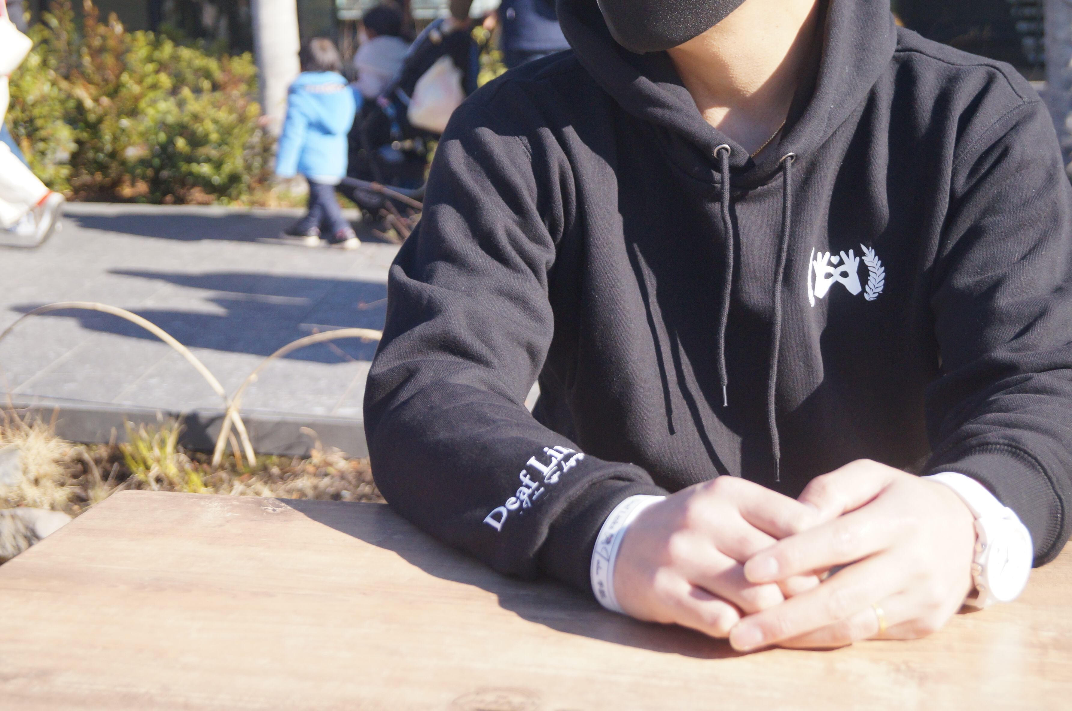 ✔︎DeafLinksのロゴが深めのフードや袖口に印字されているので