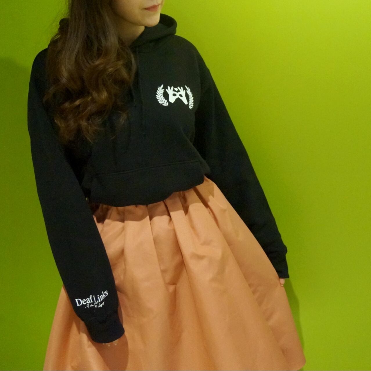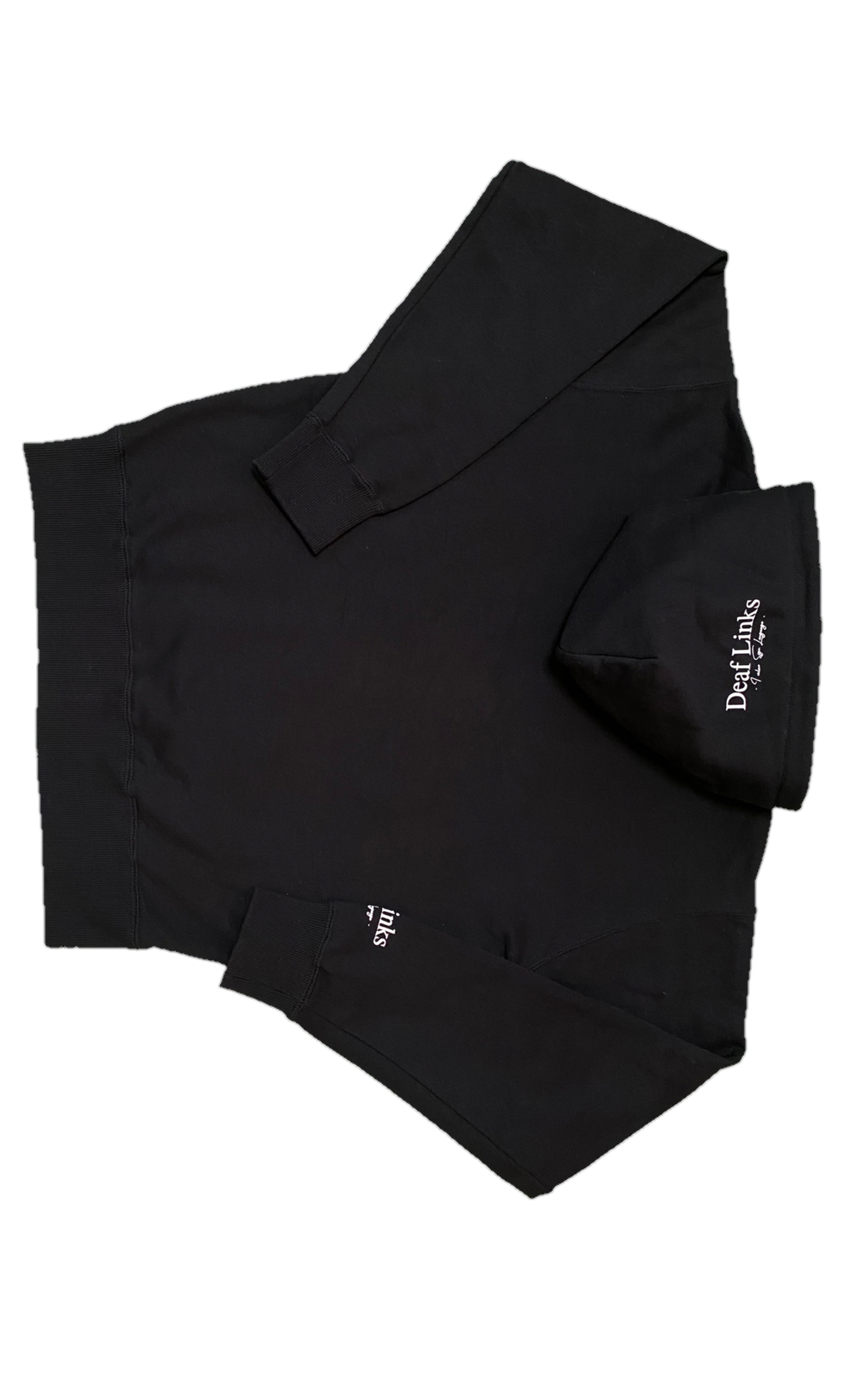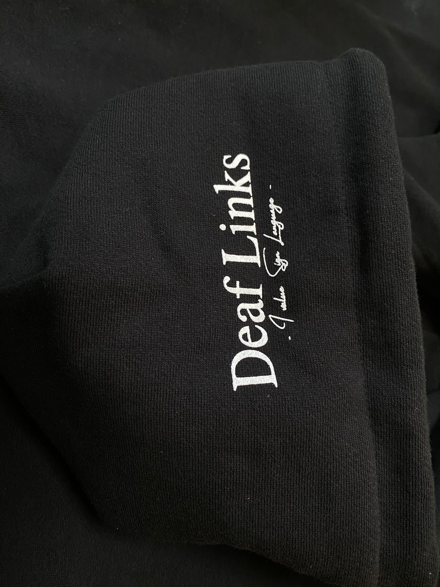 ✔︎DeafLinksのロゴが深めのフードや袖口に印字されているので