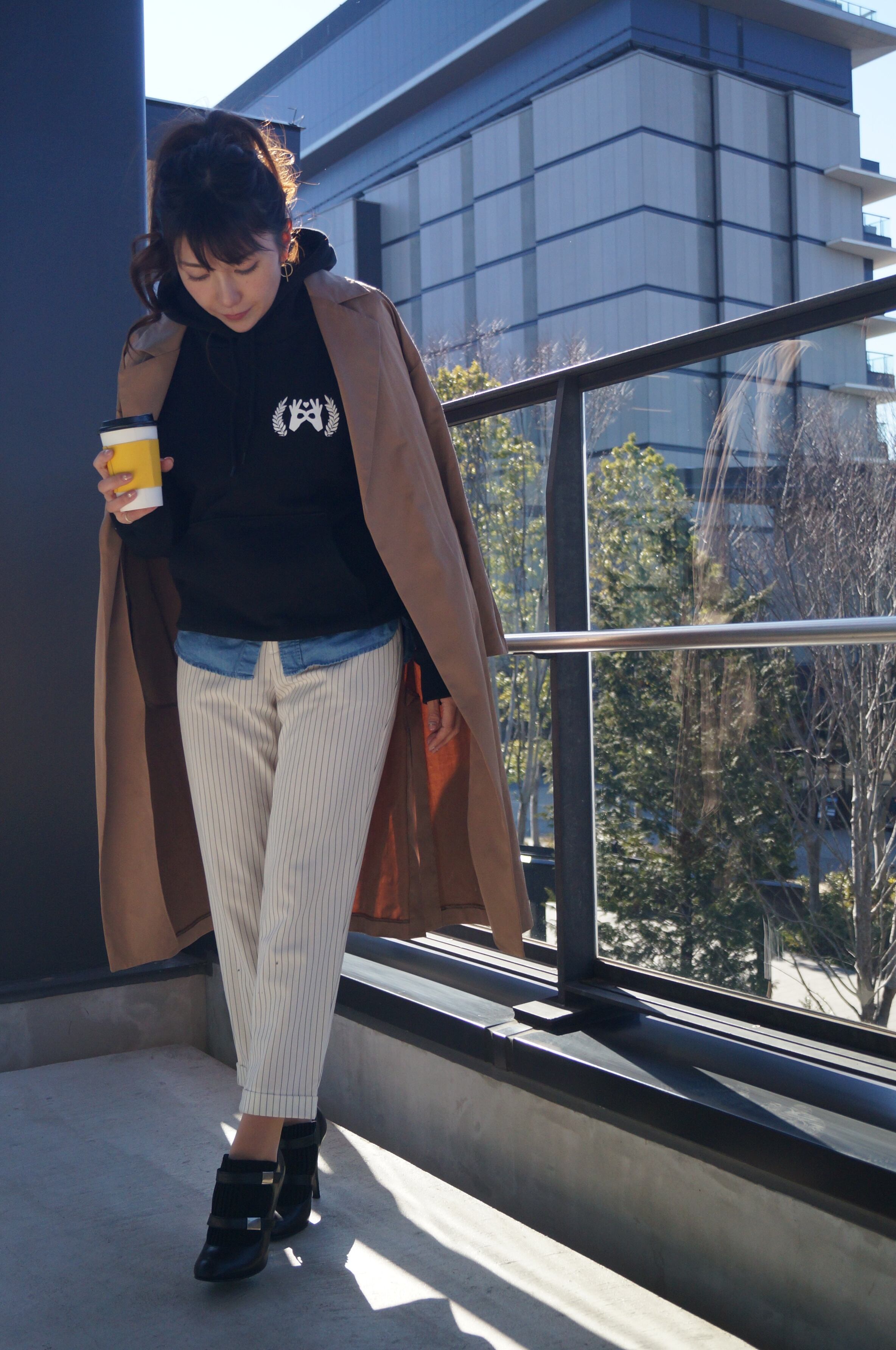 ✔︎パーカー独自のカジュアルさが甘辛MIXコーデにも相性抜群